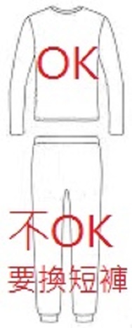 參加本校複試,著乾淨清爽、整齊服裝即可,沒有要求西裝或洋裝,但勿穿著拖鞋、服儀應得體。複試分別有體檢、體測及口試,測量身高體重時要脫鞋(著短褲要看到腳底板)以及體測有伸展肢體動作需要,必須是支援運動型式的短褲(牛仔段褲或窄版休閒褲,不能伸縮自如皆不可以),否則請自行攜帶可換穿的T恤或短褲,若考生沒有準備且服裝又不適宜施行體檢或體測,一定要現場換穿本校提供的T恤及短褲,若多人重複使用,現場無法保證提供乾燥舒適的衣褲,請考生事先自行準備為佳,下圖僅為簡單建議圖,提供考生參考。